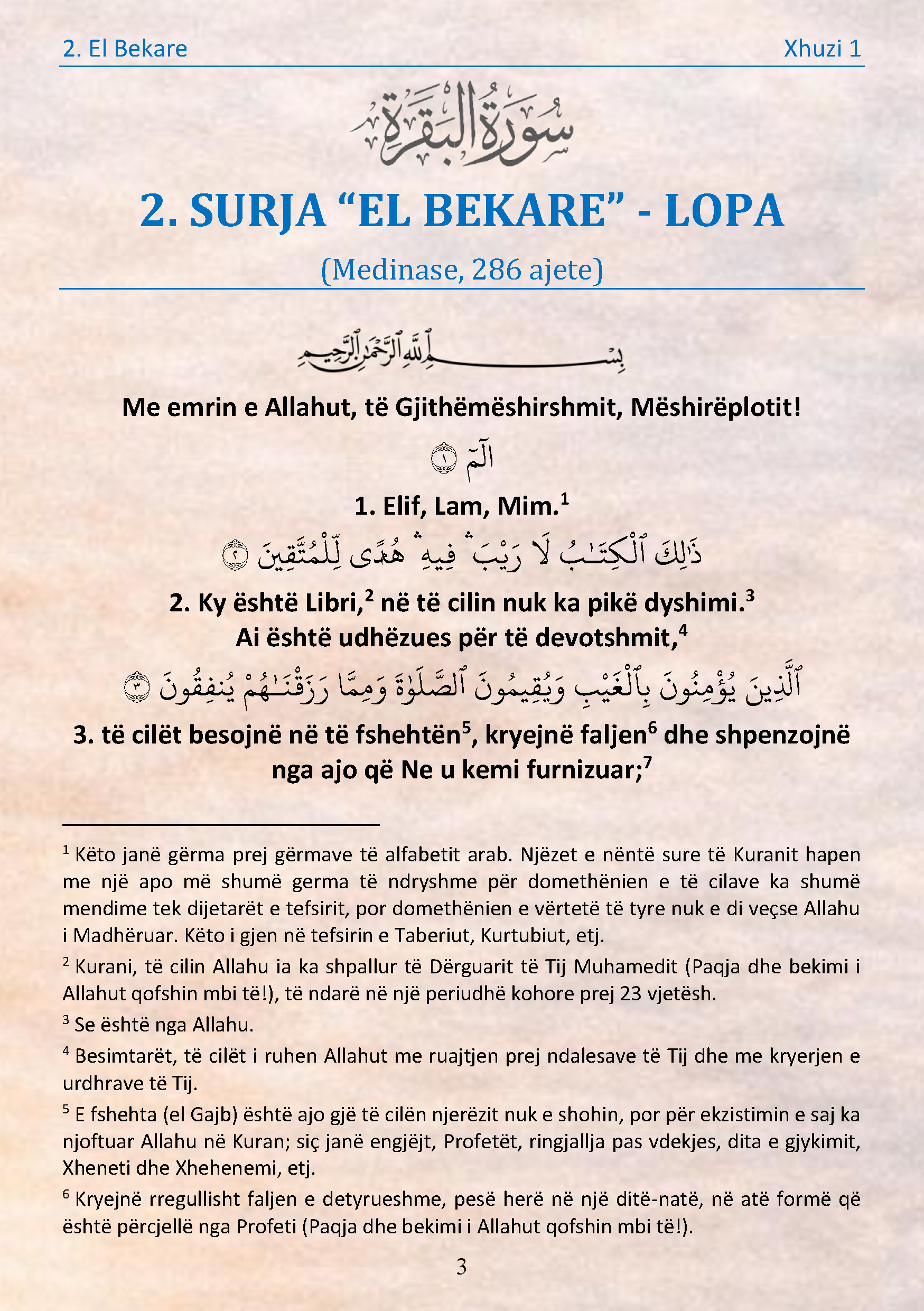 [1] Këto janë germa prej germave të alfabetit arab. Njëzet e nëntë sure të Kuranit hapen me një apo më shumë germa të ndryshme për domethënien e të cilave ka shumë mendime tek dijetarët e tefsirit, por domethënien e vërtetë të tyre nuk e di veçse Allahu i Madhëruar. Këto i gjen në tefsirin e Taberiut, Kurtubiut, etj.
