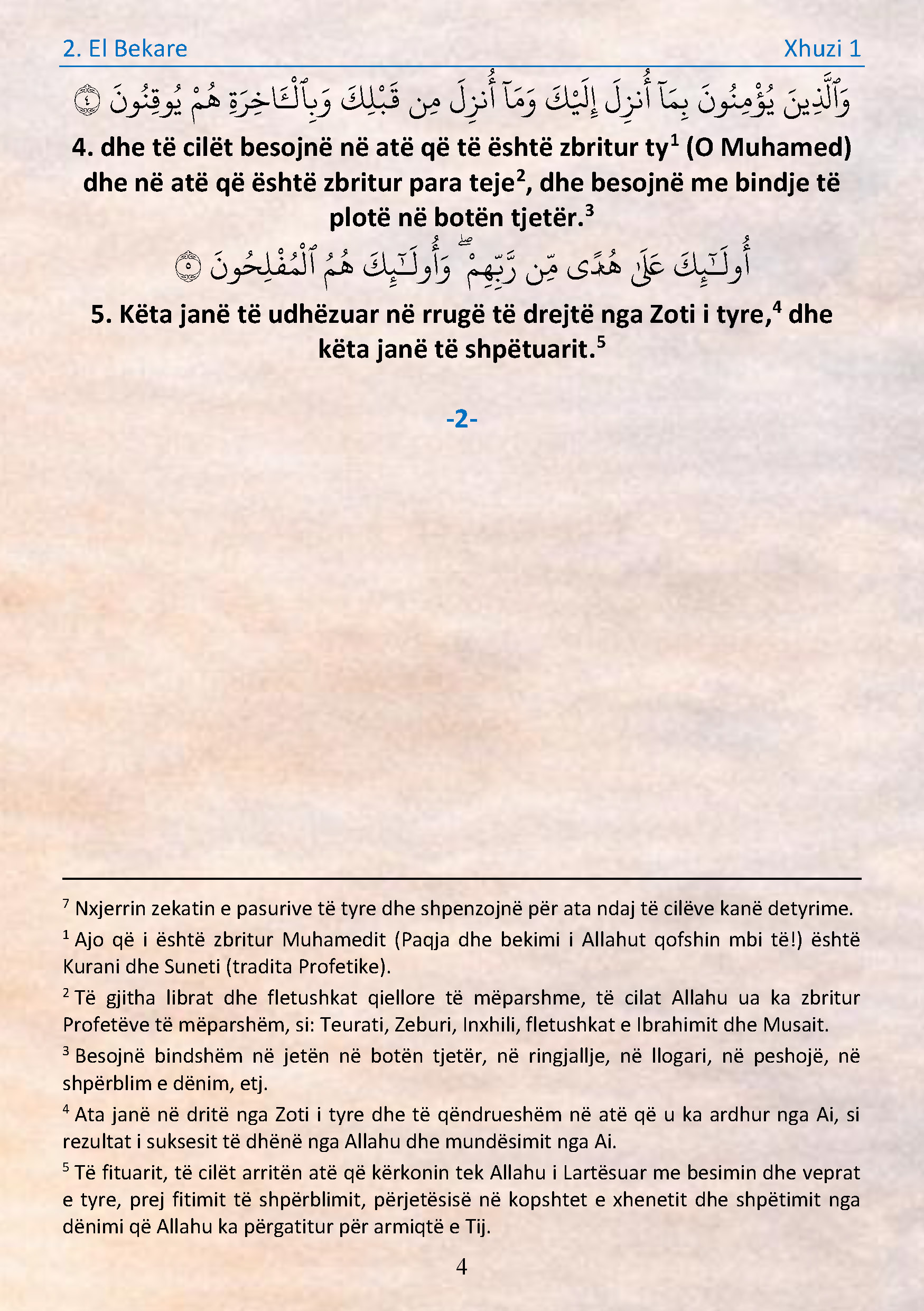 - Ata të cilët besojnë në atë që të është zbritur ty[8] (O Muhamed) dhe atë që është zbritur para teje[9], dhe besojnë me bindje të plotë në botën tjetër.[10]